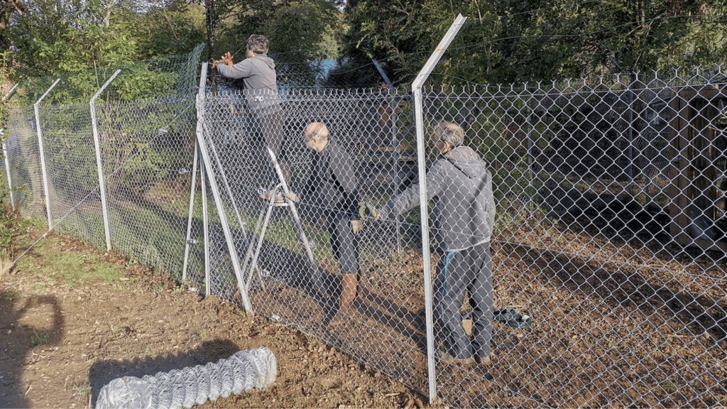 Dimanche 29 septembre, le chantier participatif a réuni les bénévoles. L’accueil avec le café et les mignardises a donné forces et courage à l’équipe au travail dès 9h00. La pose du retour sur le nouveau périmètre de l’enclos des renards est préparée car Julien a déjà bien avancé la veille sur la fixation des bavolets en haut des poteaux, bavolets qu’il avait poncé, pré percé et peint la semaine précédente. Quelques-uns restaient à poser et ensuite ce fut au tour du grillage à placer après avoir tendu 3 rangées de fil pour les soutenir et les tendre, Julien aux commandes, Jean Philippe à la manœuvre, Greg à l’assistance et au support.