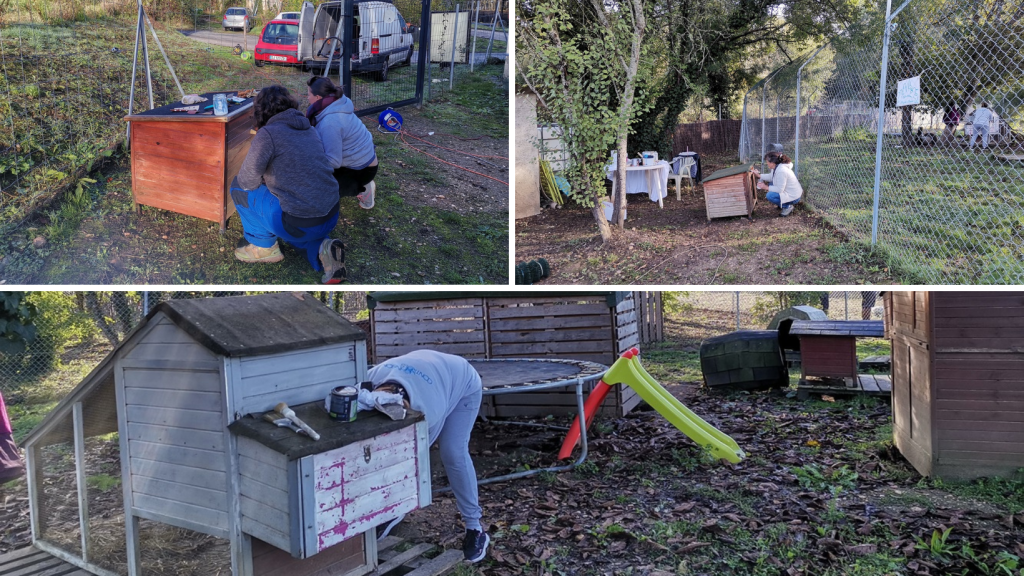 Et les filles dans tout ça ? A la déco, on maroufle les abris : ponçage des niches (plus légères) à l’extérieur de l’enclos pour éviter d’être trop nombreuse dans l’antre des goupils, ponçage des plus grosses structures in situ puis traitement lasure de tous les extérieurs – pas besoins de faire les intérieurs qui plus est sont paillés et peinture du poulailler blanc en marron pour le fondre dans le paysage (merci à Manue, artiste peintre).