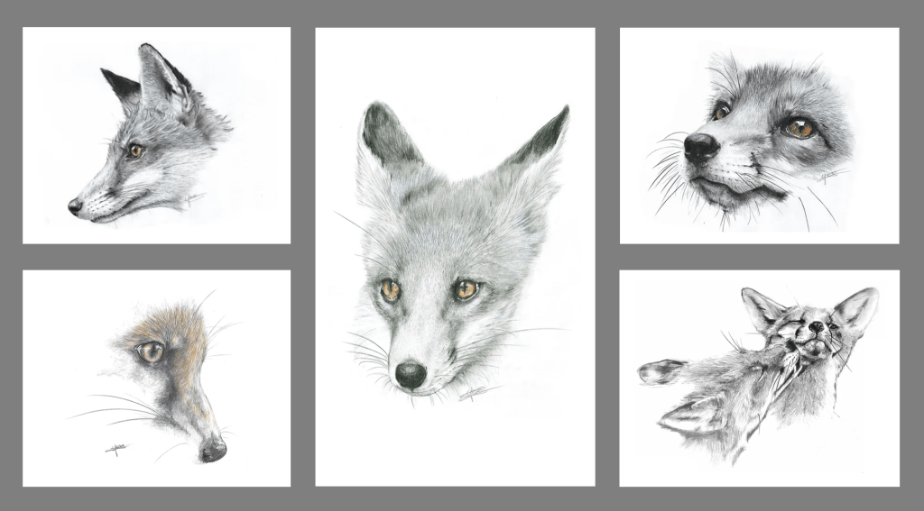 Vous trouverez un large choix de cartes au prix unitaire de 3€ (hors frais d’envoi) dont 1€ est reversé au profit du Clos des Renardises, chaque dessin du livre « Regards Renards » est disponible en carte postale 10x15cm.
