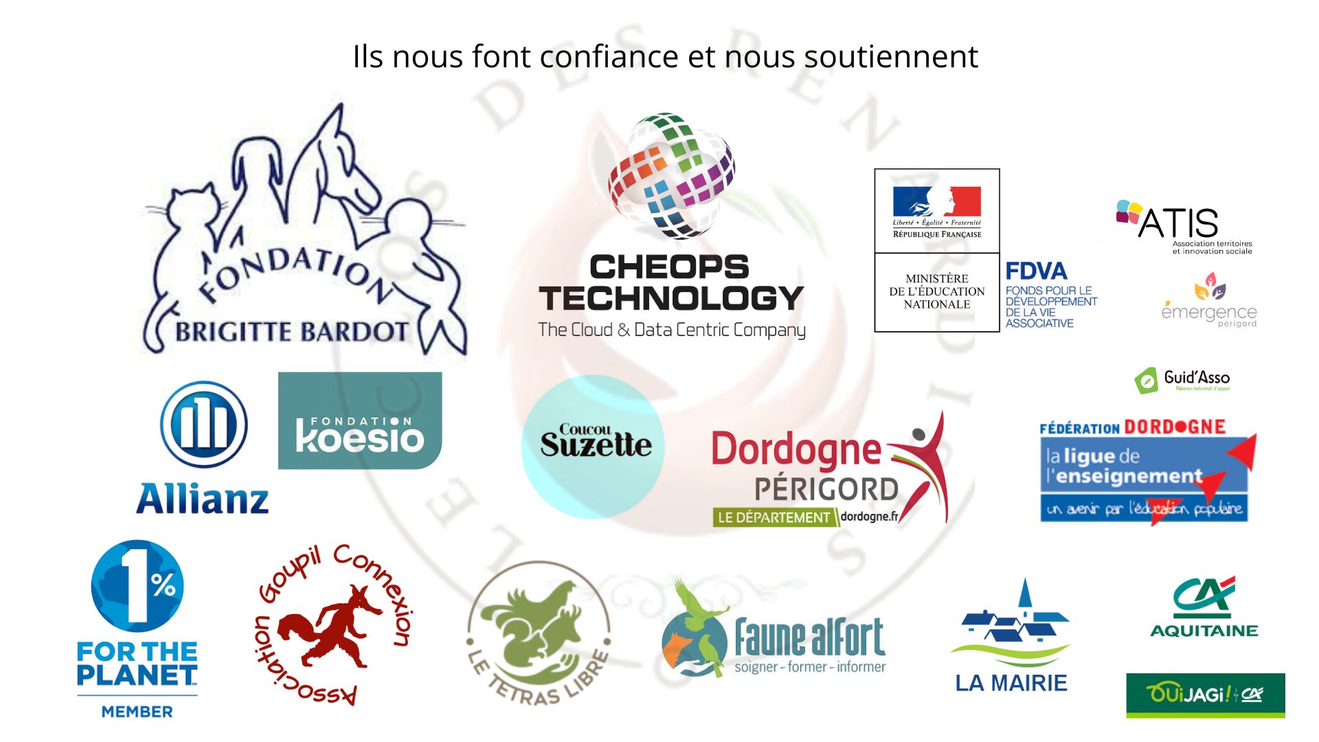 Nous sommes précieusement et généreusement aidés par la Fondation Brigitte Bardot et Chéops Technology, le Conseil départemental de Dordogne nous a aidé en 2022 par le biais du Budget participatif/votes des périgourdins, et nous fonctionnons majoritairement sur la générosité collective et le mécénat, merci à tous, généreux donateurs, adhérents, parrains et marraines de nos protégés, bénévoles … chaque jours plus nombreux pour la cause de la Nature, du vivant, des renards