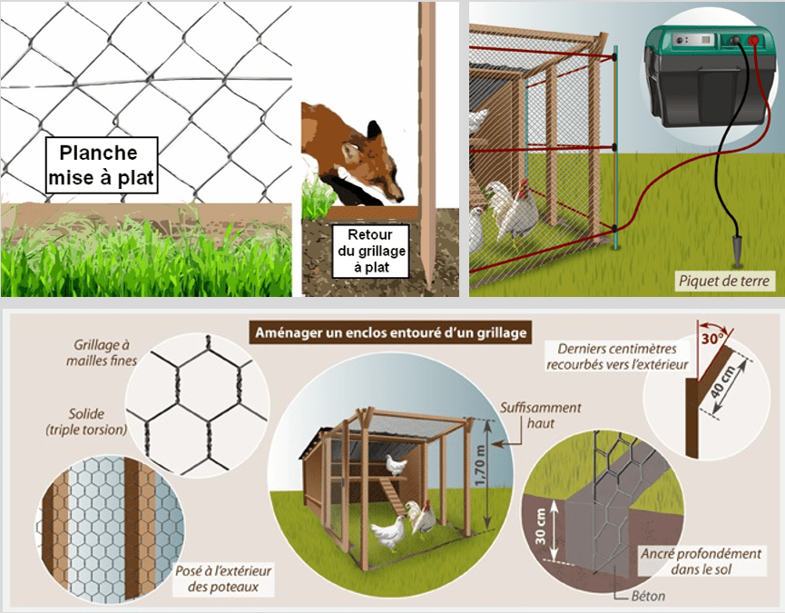 Pour la nuit, il est préférable de rentrer vos poules dans un espace fermé avec un toit ou des bavolets (si c’est un enclos) et un sol dur ou du moins avec une partie de clôture enterrée ou le pourtour pavé ou muni de planches larges (contre la clôture côté extérieur) . Vous pouvez également renforcer l’enclos par l’ajout d’un dispositif électrique (voir exemples ci-dessus).