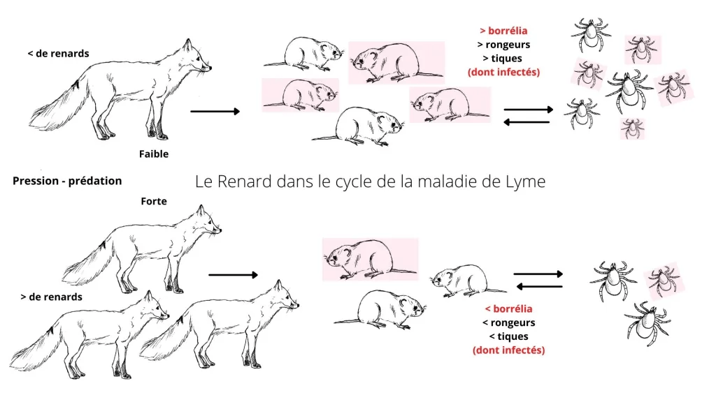 Selon une étude récente[1], la présence du Goupil exerce une importante pression d’intimidation sur les rongeurs qui adaptent un mode vie plus discret. L’acarien parasite se tourne, de ce fait, vers d’autres espèces plus accessibles et non-porteuses de la bactérie. Plus le renard est présent dans une zone géographique, plus le cycle de contamination est freiné, le taux de tiques serait diviser par 20.